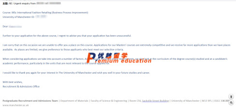 學(xué)生在2月18日收到學(xué)校發(fā)來的拒信,拒信原因研究生課程競爭激烈,位置有限,擇優(yōu)錄取;審理學(xué)生的申請學(xué)校會(huì)考慮很多因素,較低的錄取要求,學(xué)位課程列表和申請者的學(xué)術(shù)表現(xiàn)和申請課程相關(guān)的科目。