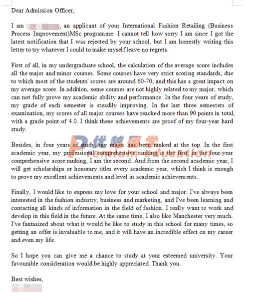 針對拒信,當(dāng)時(shí)顧問Michael老師的決定是跟學(xué)生說,等最終的學(xué)術(shù)成績出來再去跟學(xué)校進(jìn)行argue,因?yàn)楫?dāng)下去交涉很難交涉成功,目前拒信的主要原因還是因?yàn)閷W(xué)術(shù)方面不夠具有競爭力所造成的。