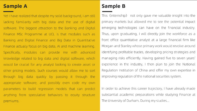 每一個(gè)招生官都需要查閱幾百份申請(qǐng)文書,如何在眾多文書中脫穎而出至關(guān)重要。文案會(huì)根據(jù)學(xué)生的信息反饋,為學(xué)生塑造一個(gè)獨(dú)特富有個(gè)性的優(yōu)質(zhì)形象,并且會(huì)要求學(xué)生對(duì)行業(yè)以及專業(yè)的進(jìn)行深入思考,對(duì)于學(xué)生問卷中內(nèi)容能進(jìn)行有效的延展,能結(jié)合學(xué)生自身情況和專業(yè)要求進(jìn)行信息整合,側(cè)重院校要求,補(bǔ)充豐富生動(dòng)的細(xì)節(jié)。