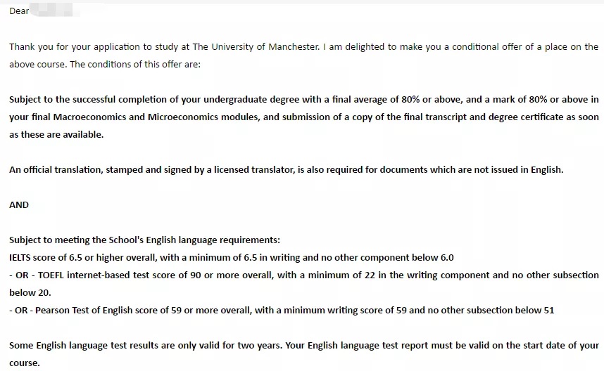 C同學(xué)申請的時(shí)間也是比較晚的,在看到身邊同學(xué)陸陸續(xù)續(xù)收到心怡的offer難免著急,多次和優(yōu)越的顧問確認(rèn)定校方案。因?yàn)閮?yōu)越老師很耐心地安撫和跟進(jìn)流程,加上一直不間斷地關(guān)注優(yōu)越發(fā)布的申請案例情況,同學(xué)對優(yōu)越的申請幫助越來越有信心。最終在年后剛剛復(fù)工的時(shí)候,C同學(xué)就收到了曼大最好的經(jīng)濟(jì)學(xué)專業(yè)offer!