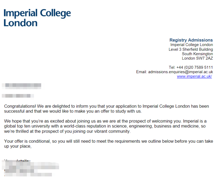 拿到了帝國理工學院(IC)、倫敦大學學院(UCL)、新國立(NUS)、南洋理工(NTU)的化學工程offer。