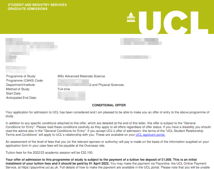 University College London(UCL) Advanced Materials Science MSc
