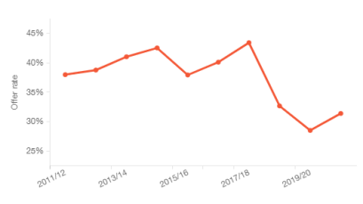 LSE的法學(xué)碩士在2021年申請的人數(shù)是2310人,錄取人數(shù)是725人,錄取率達(dá)到31%,但是根據(jù)近幾年的數(shù)據(jù)對比來看,總體還是呈現(xiàn)下滑趨勢,由此可知申請者之間的競爭性越來越大。