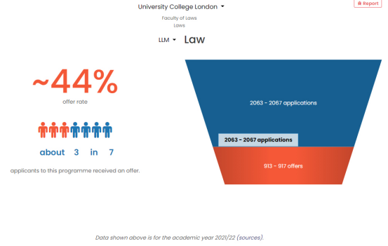 從往年的錄取數(shù)據(jù)中可以看到,UCL的法學(xué)碩士在2021年申請者人數(shù)達(dá)到了2063-2067,拿到offer的同學(xué)有913-917名,錄取率在44%左右。但是從近幾年的數(shù)據(jù)來看,UCL和LSE很相似,總體還是呈下降的趨勢,這跟申請者人數(shù)越來越多是有必然聯(lián)系的。因此競爭也仍然還是非常激烈的。