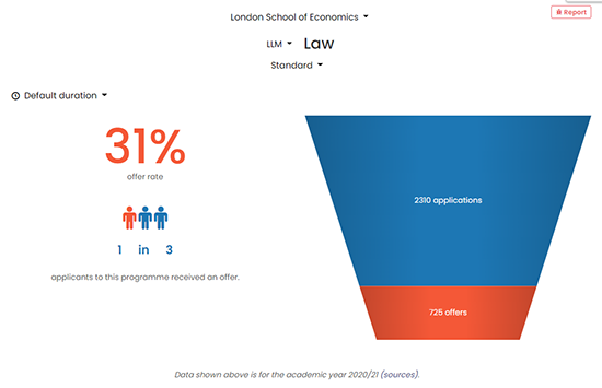 LSE的法學(xué)碩士在2021年申請(qǐng)的人數(shù)是2310人,錄取人數(shù)是725人,錄取率達(dá)到31%,但是根據(jù)近幾年的數(shù)據(jù)對(duì)比來看,總體還是呈現(xiàn)下滑趨勢,由此可知申請(qǐng)者之間的競爭性越來越大。