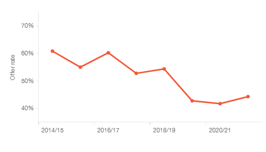 從往年的錄取數(shù)據(jù)中可以看到,UCL的法學(xué)碩士在2021年申請(qǐng)者人數(shù)達(dá)到了2063-2067,拿到offer的同學(xué)有913-917名,錄取率在44%左右。但是從近幾年的數(shù)據(jù)來看,UCL和LSE很相似,總體還是呈下降的趨勢,這跟申請(qǐng)者人數(shù)越來越多是有必然聯(lián)系的。因此競爭也仍然還是非常激烈的。
