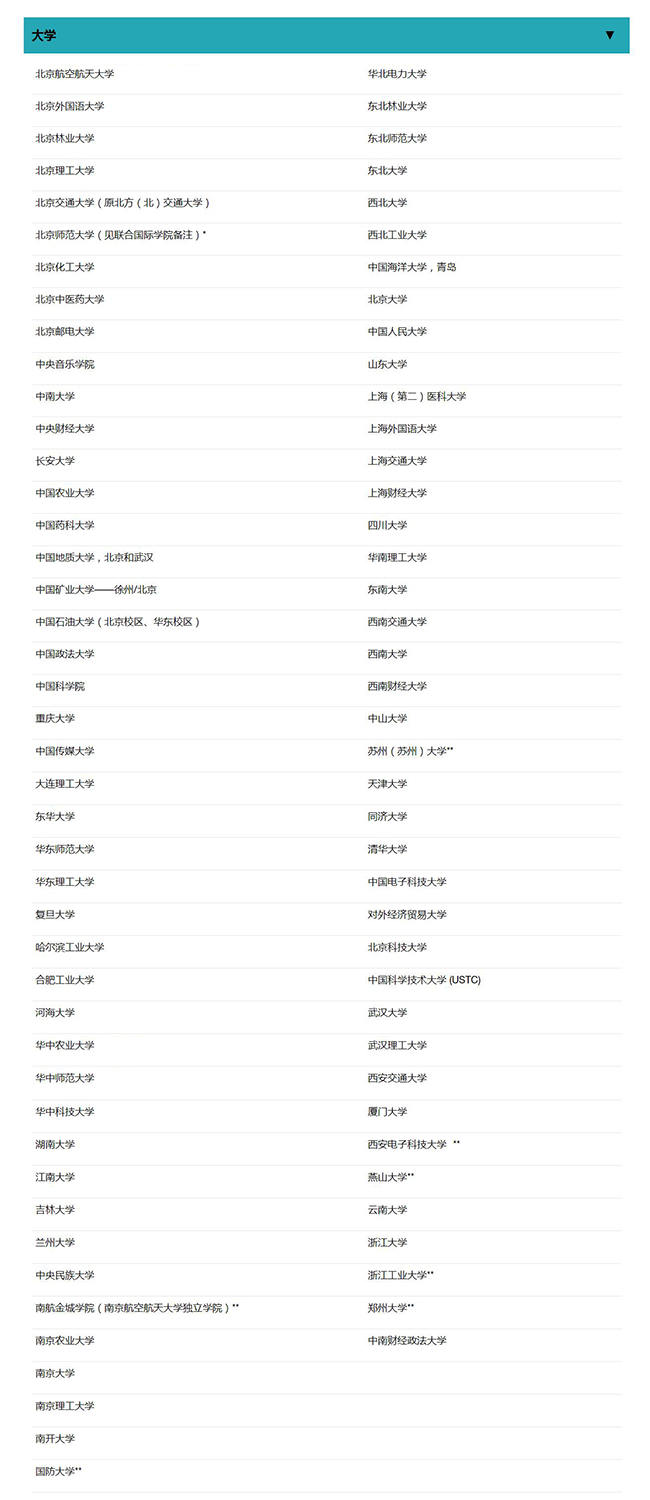 這次更新直接將Group A和Group B合并為一個list,包含主要的985和211院校,需要注意的是并非所有985/211院校都在這個名單內(nèi),同時還有三本獨立學院南航金城學院也包括在內(nèi),名單共84所院校。