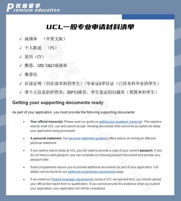 我們這里以UCL為例,英國碩士申請一般需要準(zhǔn)備的材料有以下這些。