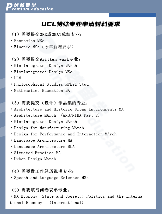 除了常規(guī)的成績單、PS、CV等材料以外,UCL還有部分專業(yè)有特殊的申請材料要求,具體情況如下。