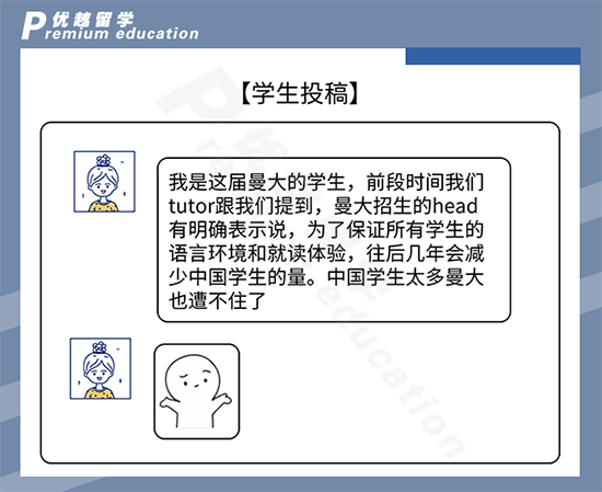 另外,優(yōu)越收到風聲,曼大招生負責任有明確表示,為了保證所有學生的語言環(huán)境和就讀體驗,往后會減少中國學生的量。所以接下來陸本學生的申請就是一個字——難!