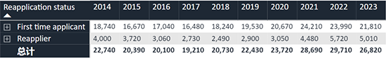 今年,共有65220名學(xué)生首次申請(qǐng),8870名學(xué)生重新申請(qǐng),首次申請(qǐng)(Firsttimeapplicant)和重新申請(qǐng)(Reapplier)學(xué)生人數(shù)有所下降。