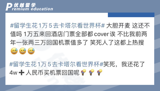 前幾天,#留學生花一萬五去卡塔爾看世界杯#的新聞沖上熱搜。四年一度的世界杯激戰(zhàn)正酣,在英國留學的小蔣曬出他三天看兩場世界杯的賬單,總預算約1.5萬人民幣。