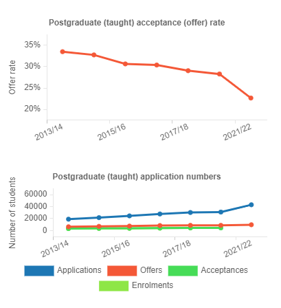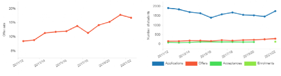 然而及時(shí)錄取率如此之低的情況下,LSE歷年來(lái)的申請(qǐng)人數(shù)仍在逐年增加。近五年LSE碩士申請(qǐng)的人數(shù)已經(jīng)從2016年27737人上升至2021年40108人。然而offer發(fā)放率卻從2016年的30.4%下降到2021年的22.7%。