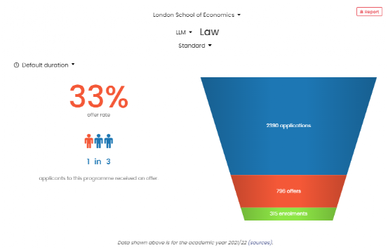雖然法學(xué)在文科專業(yè)中申請(qǐng)人數(shù)最多,但錄取人數(shù)也是全文科第一。21年LSE法學(xué)共收到2390份申請(qǐng),共發(fā)放796份offer,錄取率達(dá)到了33%。同時(shí)法學(xué)的中國(guó)學(xué)生申請(qǐng)人數(shù)也是最多的,占總申請(qǐng)人數(shù)的25%左右。