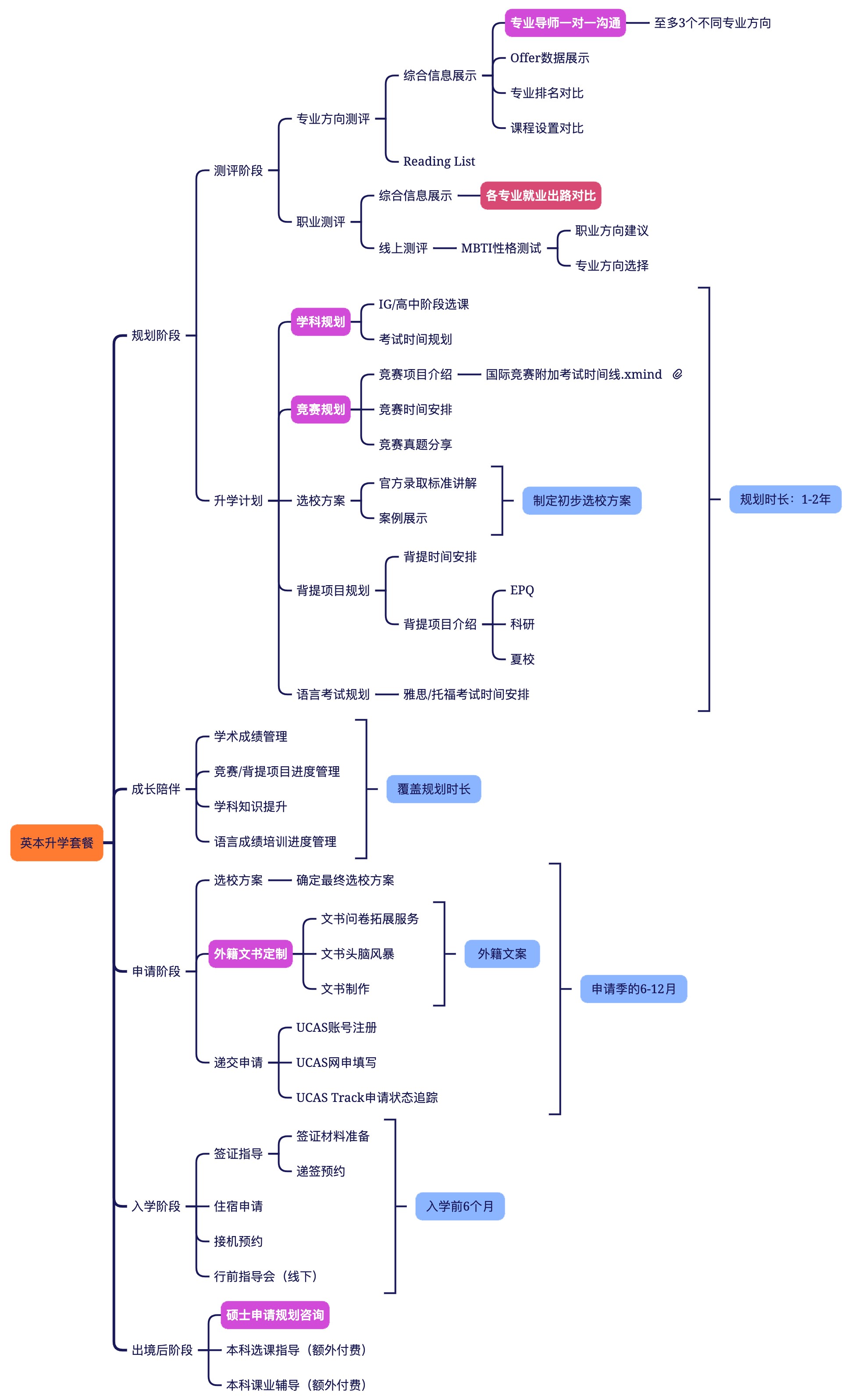 1、升學(xué)規(guī)劃項(xiàng)目(包括規(guī)劃階段?成長陪伴?申請階段?入學(xué)階段?出境后階段)