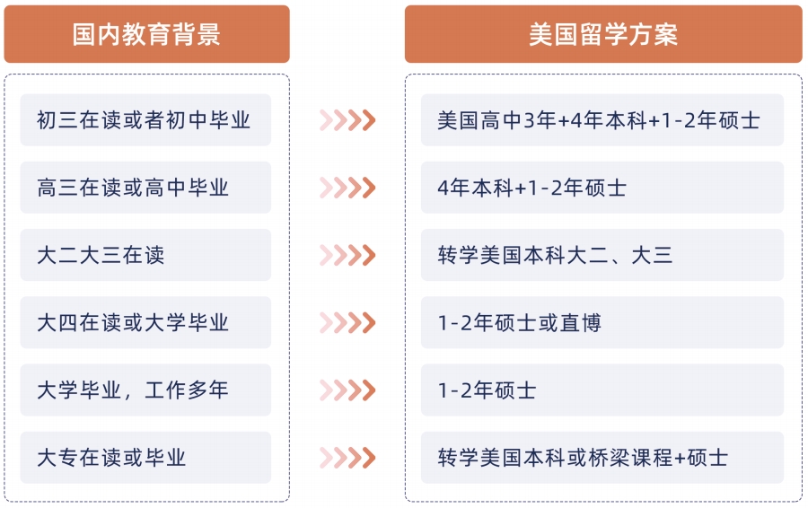 ① 對于初三在讀或初中畢業(yè)的同學(xué),我們提供從高中到碩士全線升學(xué)方案,即美國高中3年+本科4年+碩士1~2年;