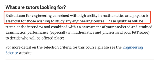 牛津在專業(yè)的官網(wǎng)上明確指出了,他們希望錄取對工程專業(yè)有著極大熱情并且自身數(shù)理能力是非常優(yōu)秀的學(xué)生,以及在牛津前兩年的課程設(shè)置中數(shù)學(xué)相關(guān)的科目占到了很大的比例,其次在這個專業(yè)的職業(yè)部分,講述的是他目前的工作,就是把數(shù)學(xué)技能運用與解決各式各樣的工程問題,我們也可以看到一位來自牛津工程專業(yè)畢業(yè)生的自述。