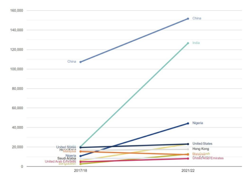 根據(jù)近日英國(guó)高等教育統(tǒng)計(jì)局(HESA)公布的數(shù)據(jù),2021/22學(xué)年英國(guó)留學(xué)生總?cè)藬?shù)漲至68萬(wàn)(比去年上漲12%),中國(guó)的學(xué)生總數(shù)最多,有17萬(wàn)人,其中151,690人來(lái)自中國(guó)大陸。