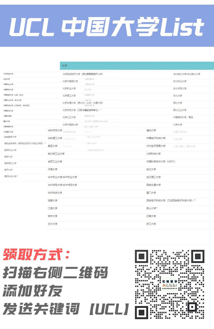 這份UCL發(fā)布的認(rèn)可中國(guó)大學(xué)名單大家可以去校方官網(wǎng)找到,急需的同學(xué)也可以添加小助手領(lǐng)取一下。(下圖掃碼添加小助手發(fā)送【UCL】即可)