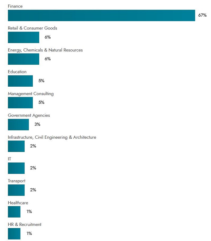 其中碩士畢業(yè)生從事最多的行業(yè)分別為:教育教學(xué)(23.7%)、學(xué)術(shù)研究和高等教育(13%)、衛(wèi)生保健(11.8%)、金融服務(wù)(5.2%)、政策與管理(4.9%)、IT技術(shù)(4.5%)……