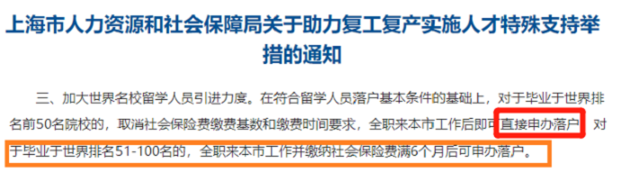 就比如去年,上海人社局宣布放寬留學(xué)生回國(guó)落戶政策,給世界大學(xué)排名Top100院校的畢業(yè)生,給出了極具吸引力的優(yōu)惠政策: