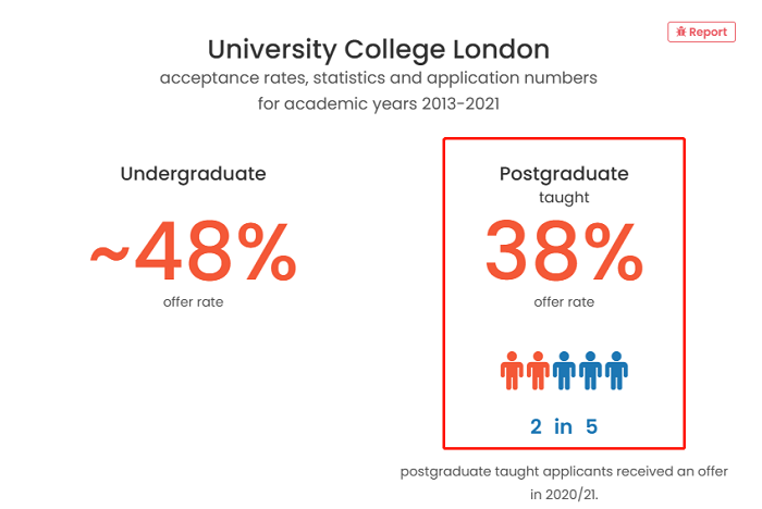 作為G5院校中開設(shè)規(guī)模最大、也是中國(guó)學(xué)生比較鐘愛的學(xué)校,UCL(倫敦大學(xué)學(xué)院)研究生專業(yè)的平均錄取率約為 38%。