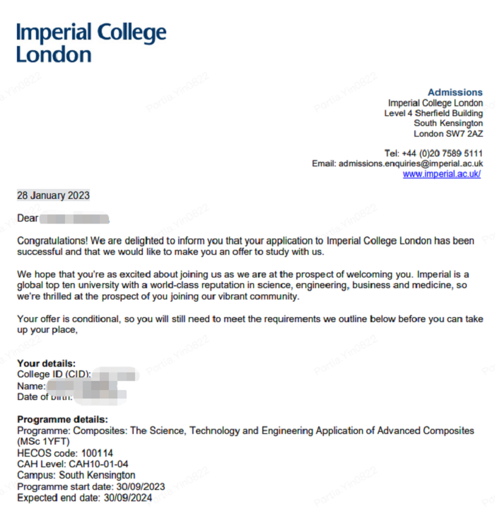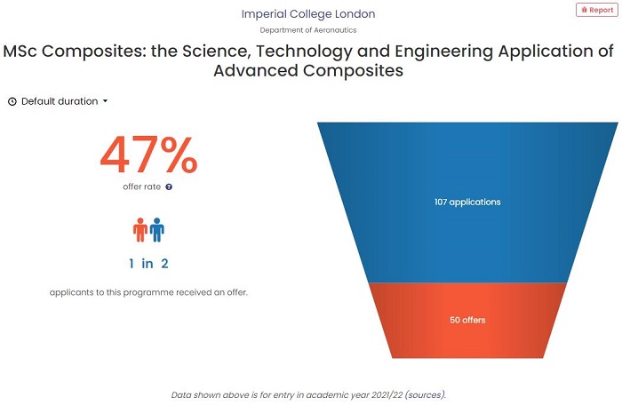 在最初定校定專業(yè)上,因?yàn)橥瑢W(xué)的夢(mèng)校是IC,我們沒有直接匹配材料相關(guān)專業(yè),而是選擇了同一學(xué)院下的非熱門專業(yè)。根據(jù)2021/22年Admission Report的數(shù)據(jù),Composites – the Science, Technology and Engineering Application of Advanced Composites專業(yè)的錄取率在47%。所以,機(jī)會(huì)還是蠻大的。