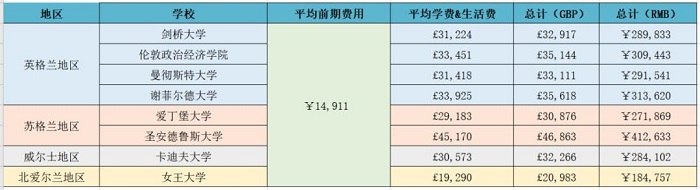5、英國各地區(qū)留學(xué)費(fèi)用匯總