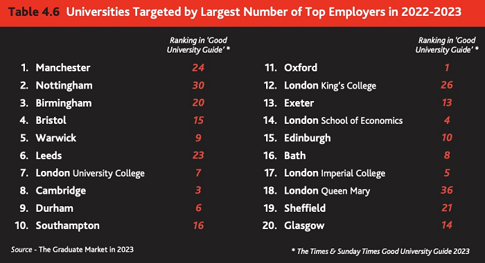 據(jù)High Fliers Research的報告,2022-2023年,最受頂尖畢業(yè)生雇主青睞的10所大學(xué)是曼徹斯特、諾丁漢、伯明翰、布里斯托、華威、利茲、倫敦大學(xué)學(xué)院、劍橋、杜倫和南安普頓。