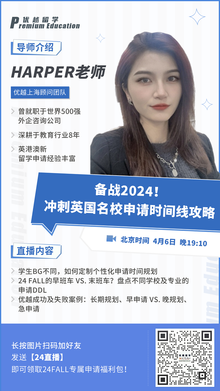 4月6日晚19:10,鎖定英國(guó)優(yōu)越留學(xué)視頻號(hào),蹲守直播間,來自優(yōu)越上海團(tuán)隊(duì)的Harper老師將為24Fall們分享超全的申請(qǐng)指南和時(shí)間線規(guī)劃!