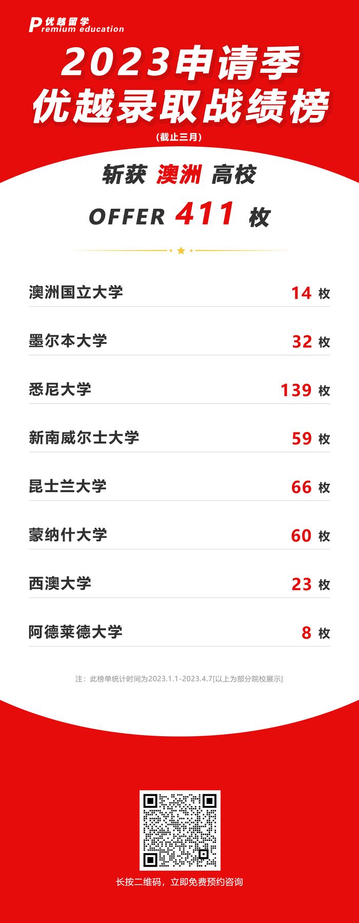 在23fall留學(xué)申請中,優(yōu)越學(xué)員共收獲澳大利亞地區(qū)offer 411枚,其中96%的offer都來自澳洲八大。