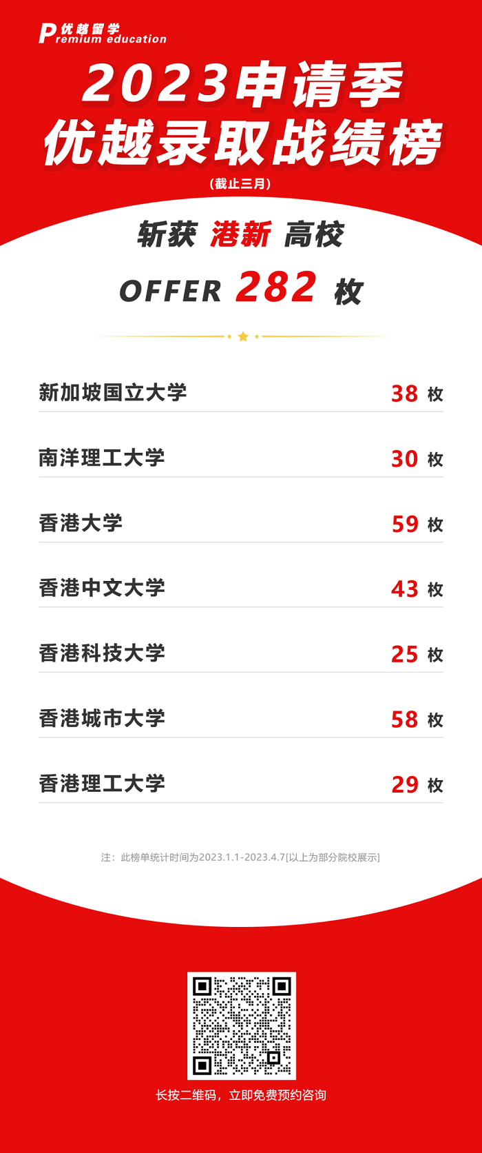 在23fall香港+新加坡兩地區(qū)的申請中,優(yōu)越學(xué)員共收獲282枚offer,其中94% 的offer來自“港三新二”。(即港大、港科大、港中文、新國立、南洋理工)