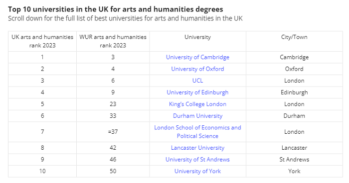 泰晤士報(bào)的英國(guó)藝術(shù)和人文學(xué)科學(xué)位排名前10的大學(xué):