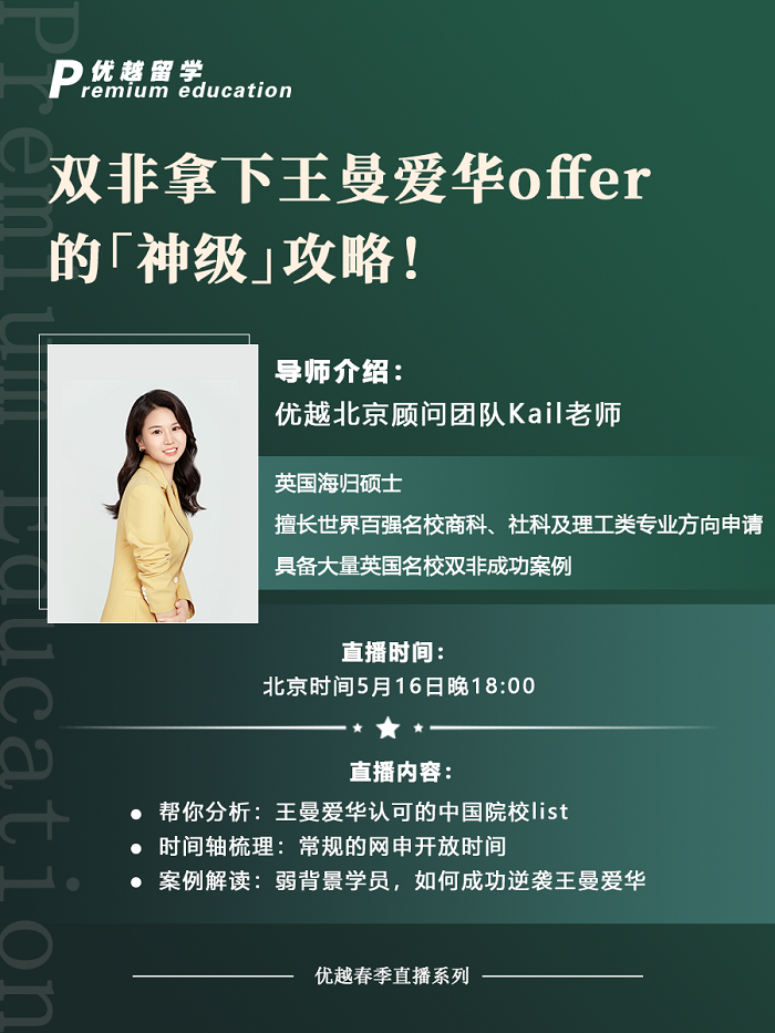 5月16日晚18:00,優(yōu)越留學(xué)北京團(tuán)隊(duì)資深顧問Kail老師將給大家分享線上講座【雙非拿下王曼愛華offer的「神級」攻略!】