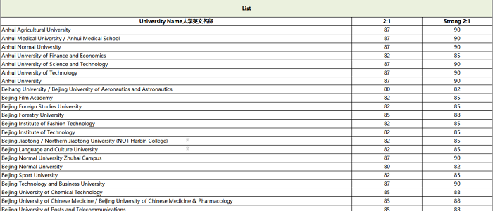 英國的院校把國內(nèi)院校分為三類,就是大家常說的985院校,211院校,雙非院校。此外,部分院校還會(huì)參考國內(nèi)院校的網(wǎng)大排名或者是上交排名。以及學(xué)校自己劃分的list。