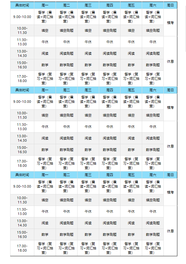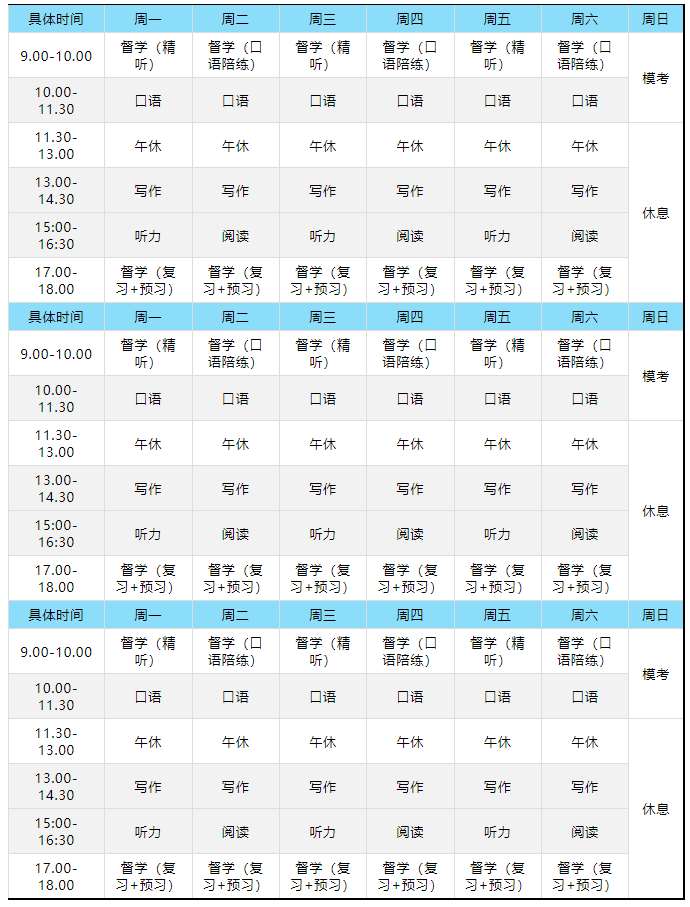 每天9~18點(diǎn),對(duì)標(biāo)高三課程體系,密集沉浸式記憶,每周一~周六,聽(tīng)說(shuō)讀寫輪次上課,周日上午進(jìn)行一場(chǎng)全真???,下午給予放松休息的時(shí)間。
