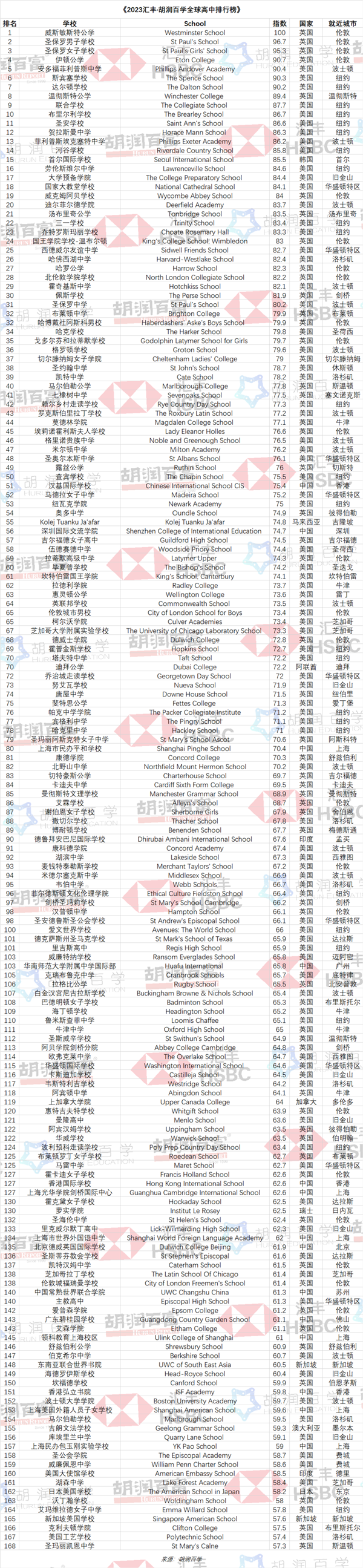 前不久,胡潤(rùn)百學(xué)聯(lián)合匯豐發(fā)布首份“全球高中排行榜”,列出了2023全球頂尖的非公立高中,評(píng)選標(biāo)準(zhǔn)包括畢業(yè)生去向、豐富的課外活動(dòng)和學(xué)校的聲譽(yù)。為中學(xué)生和家長(zhǎng)提供了一個(gè)了解全球高中教育機(jī)構(gòu)參考。
