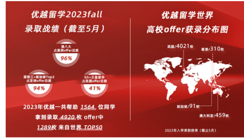 優(yōu)越留學是一家在英國注冊的中介機構(gòu),通過英國工商局、英國外交部、倫敦使館、英國移民局和英國本科官方招生中心(UCAS)的多重認證,贏得了良好的聲譽。根據(jù)初步統(tǒng)計,僅在2023年的第一季度,優(yōu)越留學成功幫助1564位學生獲得了4920個錄取通知書。令人印象深刻的是,其中1289個錄取通知來自世界百強高校,這一數(shù)據(jù)證明了優(yōu)越留學在"專注名校研究生申請"方面的專業(yè)執(zhí)著和初衷。