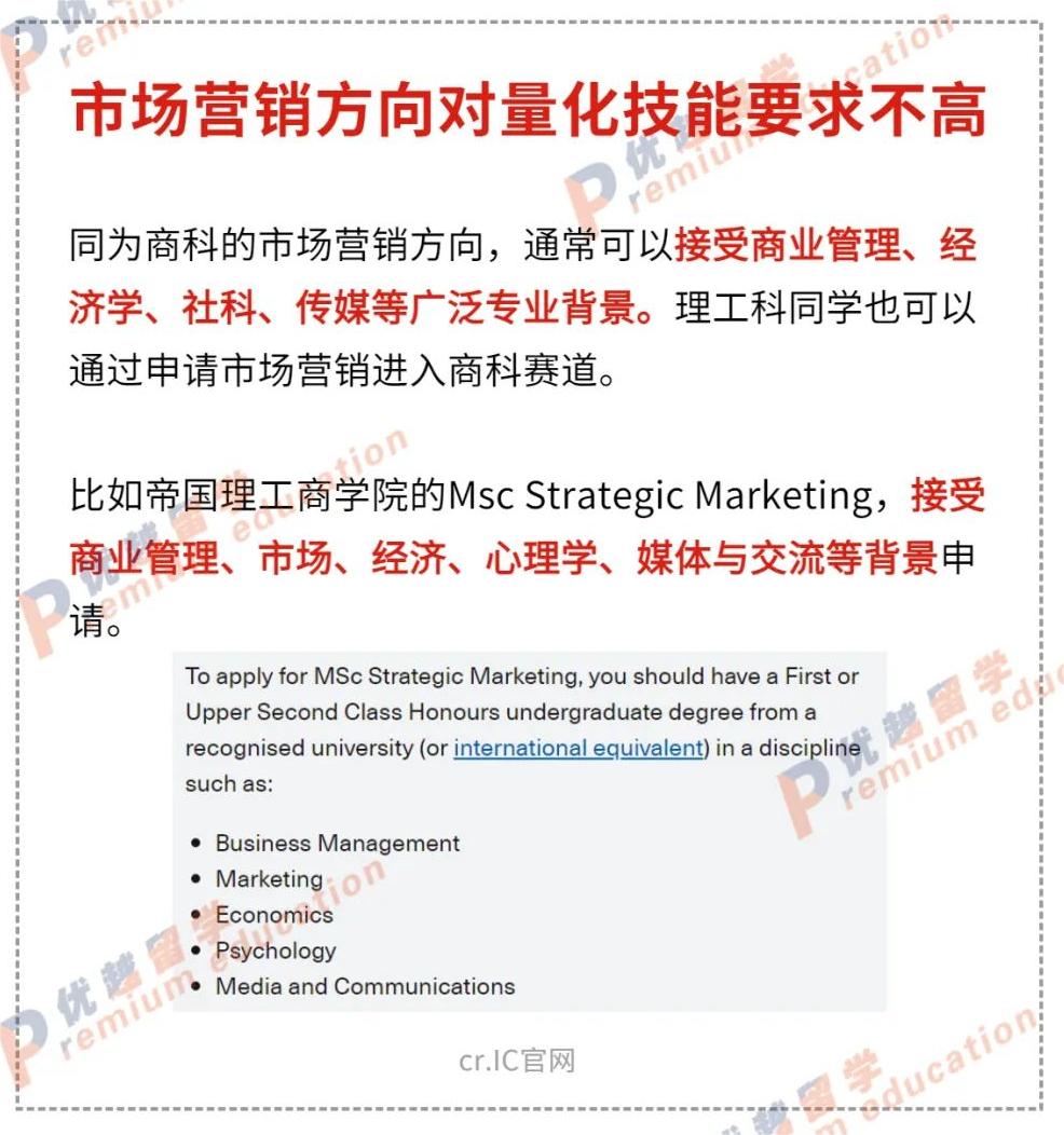 但是同為商科的市場營銷方向,相關(guān)專業(yè)對(duì)量化技能要求不高,通??梢越邮苌虡I(yè)管理、經(jīng)濟(jì)學(xué)、社科、傳媒等廣泛專業(yè)背景。如果是對(duì)本科專業(yè)并不滿意的理工科同學(xué),也可以通過申請(qǐng)市場營銷進(jìn)入商科賽道。比如帝國理工商學(xué)院的Msc Strategic Marketing,接受商業(yè)管理、市場、經(jīng)濟(jì)、心理學(xué)、媒體與交流等背景申請(qǐng)。