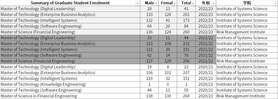 Master of Science(Financial Engineering)和Master of Technology(Enterprise Business Analytics)入讀學(xué)生數(shù)量較多。