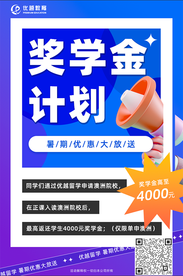 凡是在特定期間通過優(yōu)越留學(xué)申請澳洲院校,在正式入讀后,將提供學(xué)生一筆獎學(xué)金,最高達(dá)4000元!(僅限單申澳洲碩士項目)