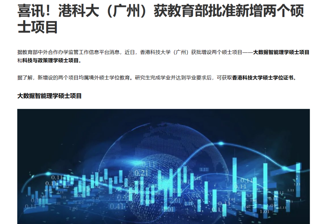 但現(xiàn)在,好消息終于來了!日前,香港科技大學(xué)(廣州)獲得批準增設(shè)兩個碩士項目,分別為“大數(shù)據(jù)智能理學(xué)碩士”和“科技與政策理學(xué)碩士”。