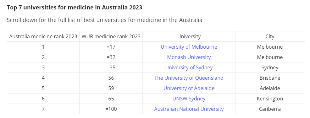 根據(jù)2023年TIMES大學(xué)排名,澳洲八大全部入圍醫(yī)療領(lǐng)域世界大學(xué)前100之列(見(jiàn)下圖)
