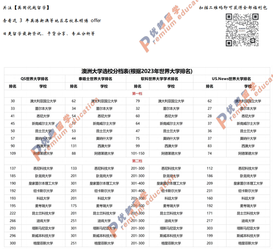 掃碼下圖還可免費(fèi)查看澳洲大學(xué)選校分檔表,澳洲八大校各大世界排名一目了然。還可以選校表check自身背景條件是否滿足學(xué)校錄取要求哦!