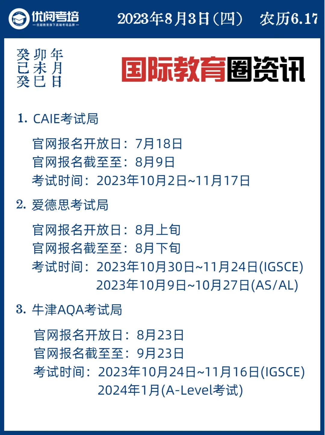 國(guó)內(nèi)主要看三大考試局(CAIE、愛德思、牛津AQA)的日程表。夏考已經(jīng)結(jié)束,IB成績(jī)7月已出,AL及IG成績(jī)將在8月中下旬公布。