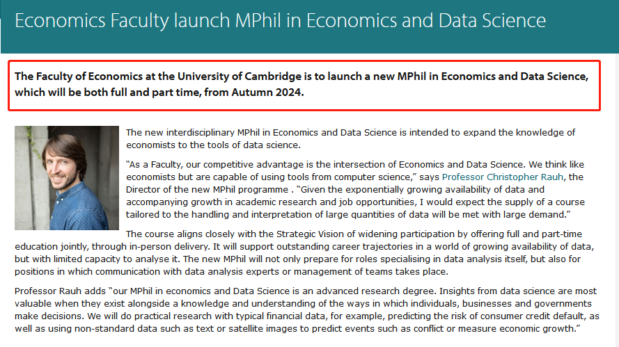 劍橋大學(xué)經(jīng)濟(jì)學(xué)院將從2024年秋季入學(xué)開始開設(shè)新專業(yè)經(jīng)濟(jì)學(xué)和數(shù)據(jù)科學(xué)碩士課程,包括全日制和非全日制。目前這個(gè)專業(yè)的具體申請(qǐng)信息還沒有公開,公布后我們會(huì)在優(yōu)越社群內(nèi)第一時(shí)間分享,感興趣的朋友歡迎掃碼加群!