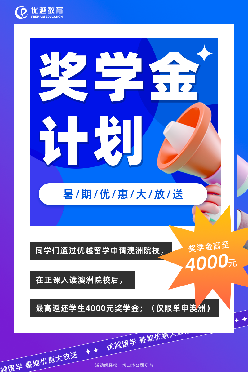 在特定期間內(nèi),通過優(yōu)越留學(xué)申請澳洲院校,并在正式入讀后,將有機(jī)會獲得一筆獎學(xué)金,最高可達(dá)4000元!這一優(yōu)惠僅適用于單申澳洲碩士項(xiàng)目的學(xué)生。
