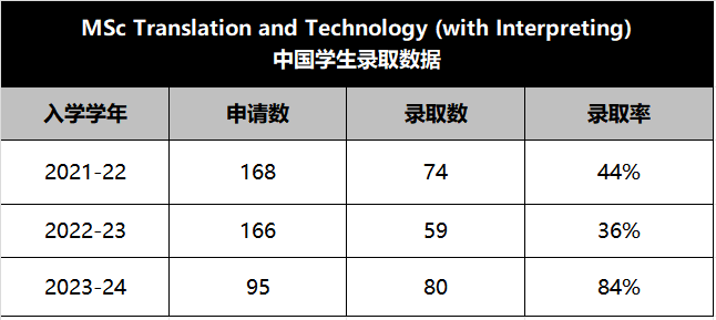根據(jù)UCL官方公布的2021-2023年錄取數(shù)據(jù),MSc Translation and Technology (with Interpreting)是UCL相對(duì)冷門的專業(yè)。近三年中國申請(qǐng)人數(shù)遞減,且不超過200,最新錄取率高達(dá)84%!