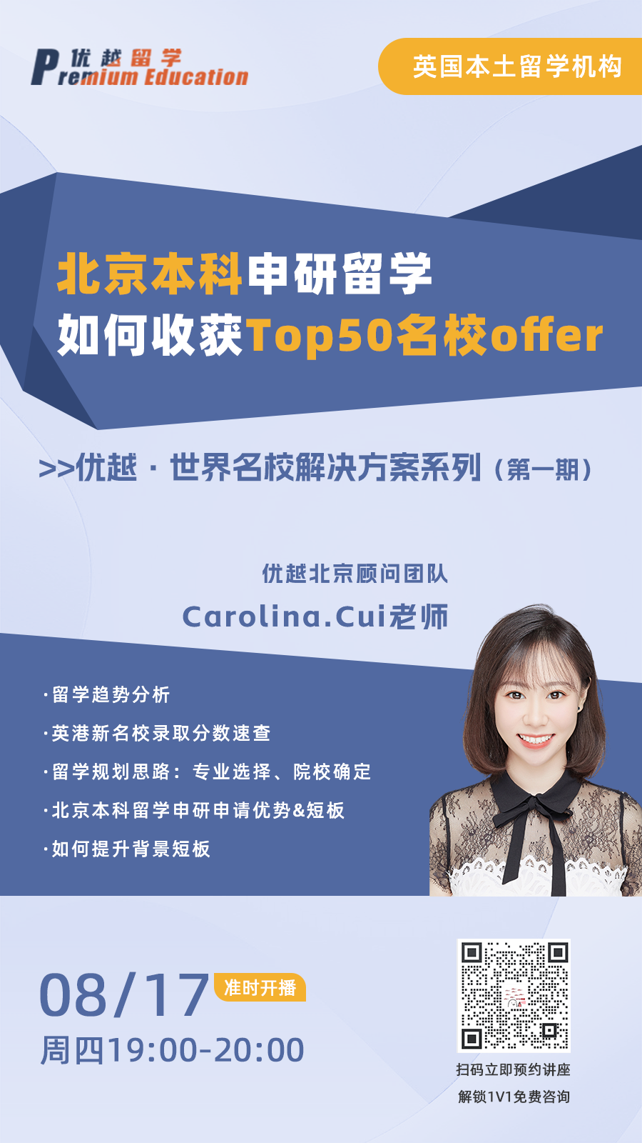以上是【本期直播預(yù)告:北京本科學生如何收獲Top50名校offer ?優(yōu)勢和短板詳細分析!】相關(guān)的全部內(nèi)容,查看更多【直播預(yù)告】相關(guān)資訊可前往【優(yōu)越留學】首頁!詳細申請規(guī)劃及方案定制請預(yù)約優(yōu)越留學顧問為你一對一解答!