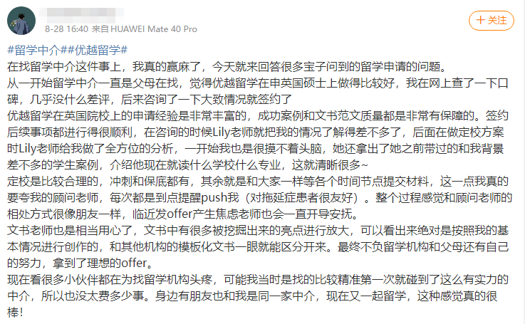 優(yōu)越留學(xué)無論是在服務(wù)水平還是專業(yè)顧問的文書水平上都廣受學(xué)生好評(píng),有無數(shù)想要申港申澳的學(xué)生反饋在優(yōu)越留學(xué)得到了良好接待和高水平的服務(wù)。